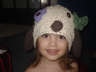 I am soo proud of this hat. It is nowhere near perfect, but I just adore it. There are ears, but they are hard to see. The hat is cotton, but the ears and nose are merino wool. I am planning on making more of the actual hat (without the ears and facial features) to perfect the pattern. I don't know though.... now that I know the basic stitches, all I want to do is start new projects!!